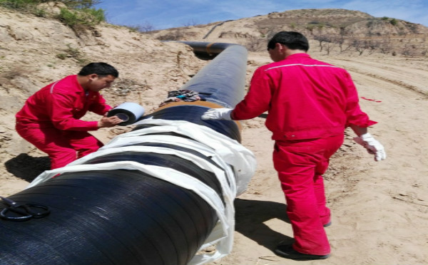 3、纏繞聚丙烯防腐膠帶待底漆表干后即可進(jìn)行,繞帶過程中必須保持均勻漲力,纏平貼實(shí)、搭接一致,纏好膠粘帶后,在埋地前為克服造成起泡現(xiàn)象,需將防腐管道采取遮陽保護(hù)的方法掩蓋24小時(shí)。