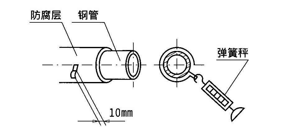 6.4.3 粘結力(剝離強度):這一指標直接關系到防腐層的質量,水的滲透能力與膠帶和鋼材之間的粘結力有關,所以應確保膠帶對鋼材具有足夠的粘結力。依據(jù)我國標準SY/T 0414-2007中的說明,邁強牌熱塑丁基橡膠改性瀝青類防腐膠帶可定稱為專用防腐帶(膠層厚、粘結力大、帶有防粘膜、可粘結聚乙烯等材料、能確保質量的防腐膠帶)。按我國SY/T 0414-2007標準,剝離強調的測量是采用下列方法進行的;用刀沿環(huán)向劃開10㎜寬、長度大于100㎜的膠帶層,直至管體。然后用彈簧秤與管壁成90度角拉開,拉開速度不大于300㎜/min,剝離強度應大于18N/㎝,該測試應在纏好膠帶24小時后進行。如下圖所示: